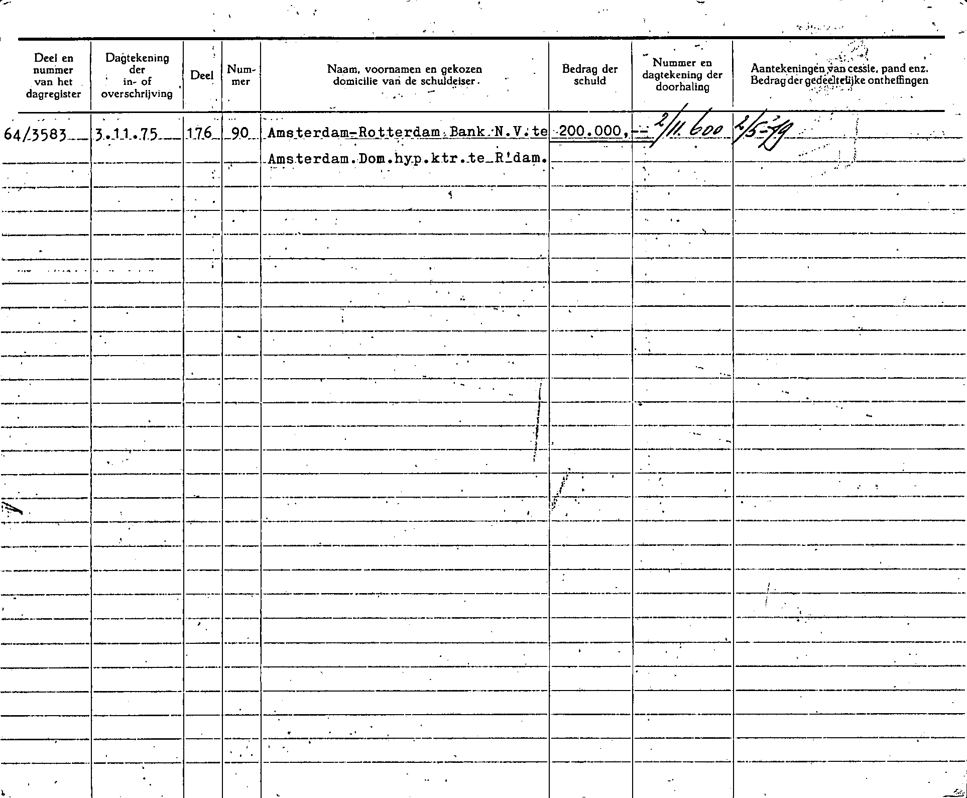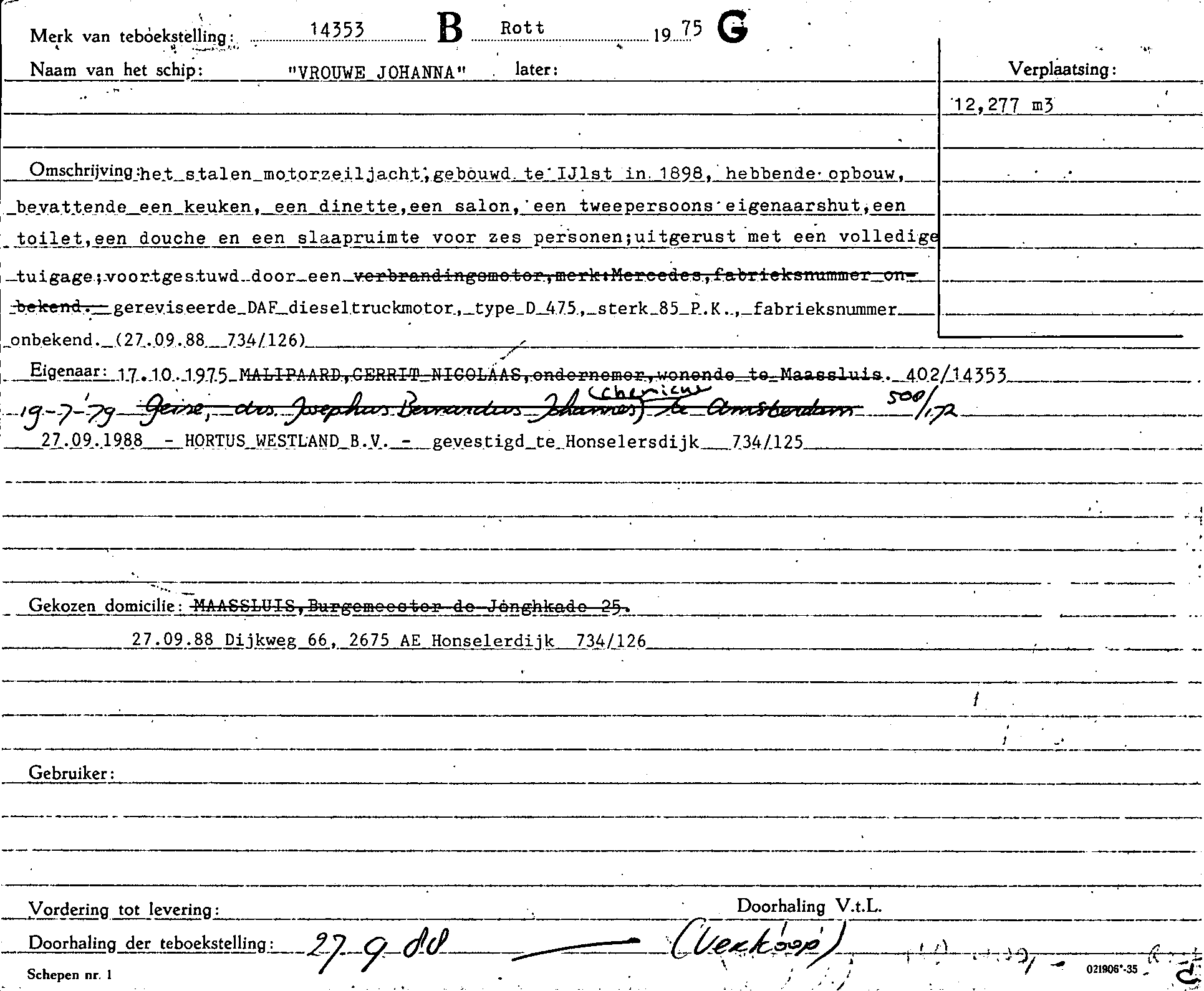 Het kadaster hield mutaties rond een brandmerk bij op kaarten. De voorkant van iedere kaart bevatte de scheeps- en eigendomsgegevens, de achterkant hypotheekgegevens. Als er veel wijzigingen in de teboekstelling kwamen dan werden er vervolgkaarten gebruikt. Daarnaast vereiste de wet per brandmerk een "Getuigschrift van branding", een bewijs dat het brandmerk ook werkelijk op het schip is aangebracht. De kaarten en/of getuigschriften voor dit brandmerk zijn bewaard gebleven en ingescand. U kunt de scans bekijken met de verwijzingen hieronder. Klik op een regel om de betreffende scan te zien. Iedere scan opent in een nieuw tabblad. |